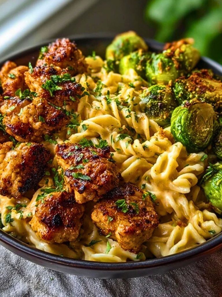 To store leftovers, place each component (chicken, pasta, Brussels) in separate airtight containers to maintain texture. Keep in the fridge for up to 3 days. Reheat the pasta gently on the stovetop with a splash of cream or water. The chicken can be reheated in a skillet or microwave, and the sprouts are best crisped up again in the oven or air fryer.